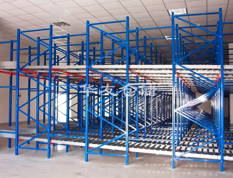 滾筒線按一定角度傾斜固定在貨架橫梁上,托盤(pán)從高端放入,沿滾筒線靠自身重力下滑。