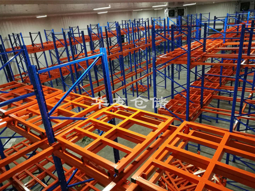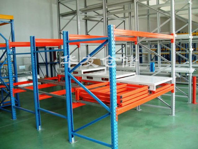 壓入式貨架是在前后梁之間以多層臺車重疊相接,從外側(cè)將托盤(或料箱)置入臺車推入,后儲存之貨物會將原先的貨物推向里面。臺車跨于傾斜軌道上,當(dāng)外側(cè)貨物被取走時(shí),里面的會自動(dòng)滑下。